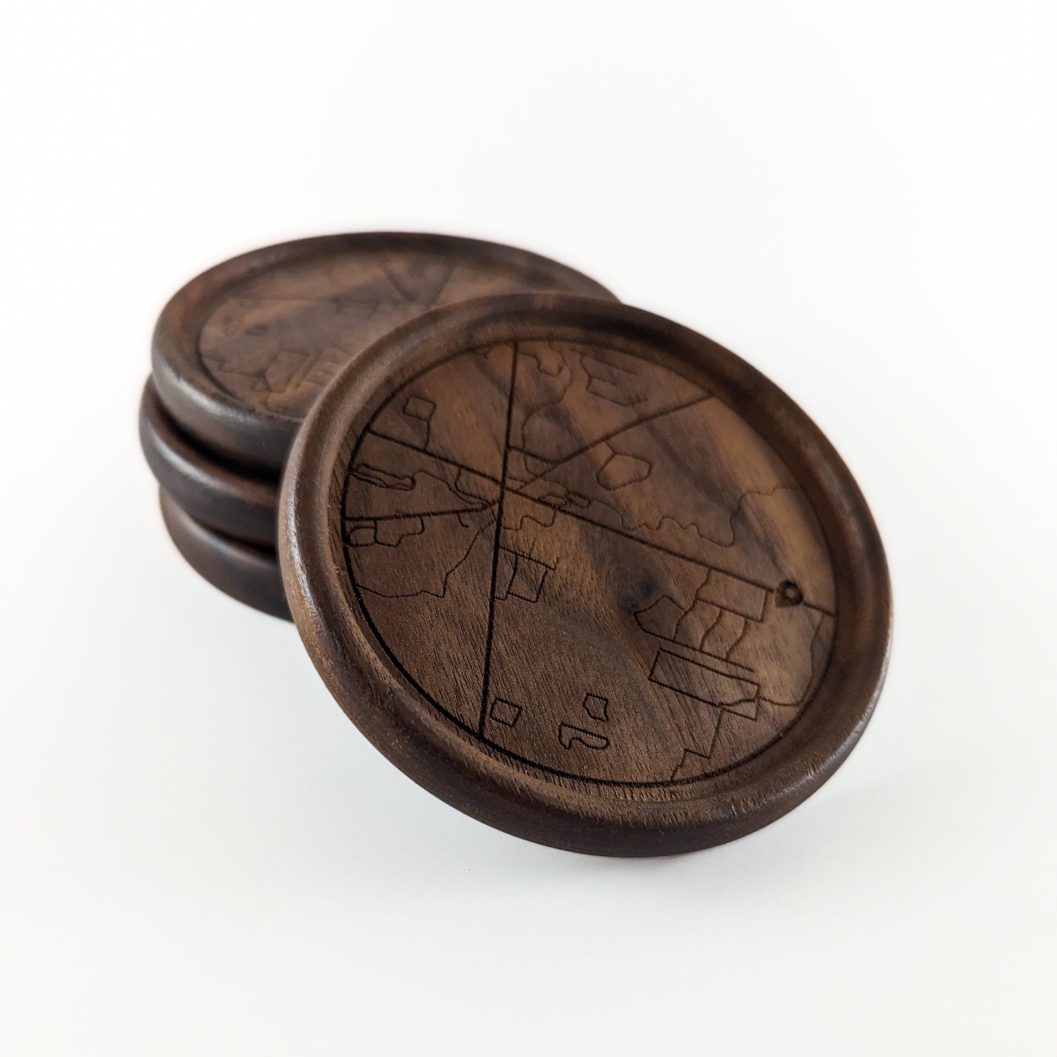 Elevate your decor with our custom wood coasters. Engraved with a map of your home address, they offer both style and practicality in one neat package. Available now, get yours today.